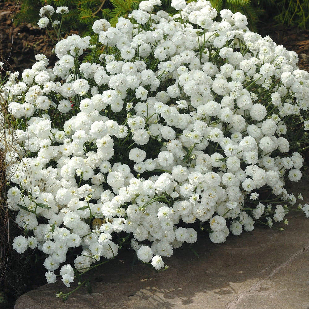 Delicate stems and myriads of white, double blossoms add a delightful airy grace to any