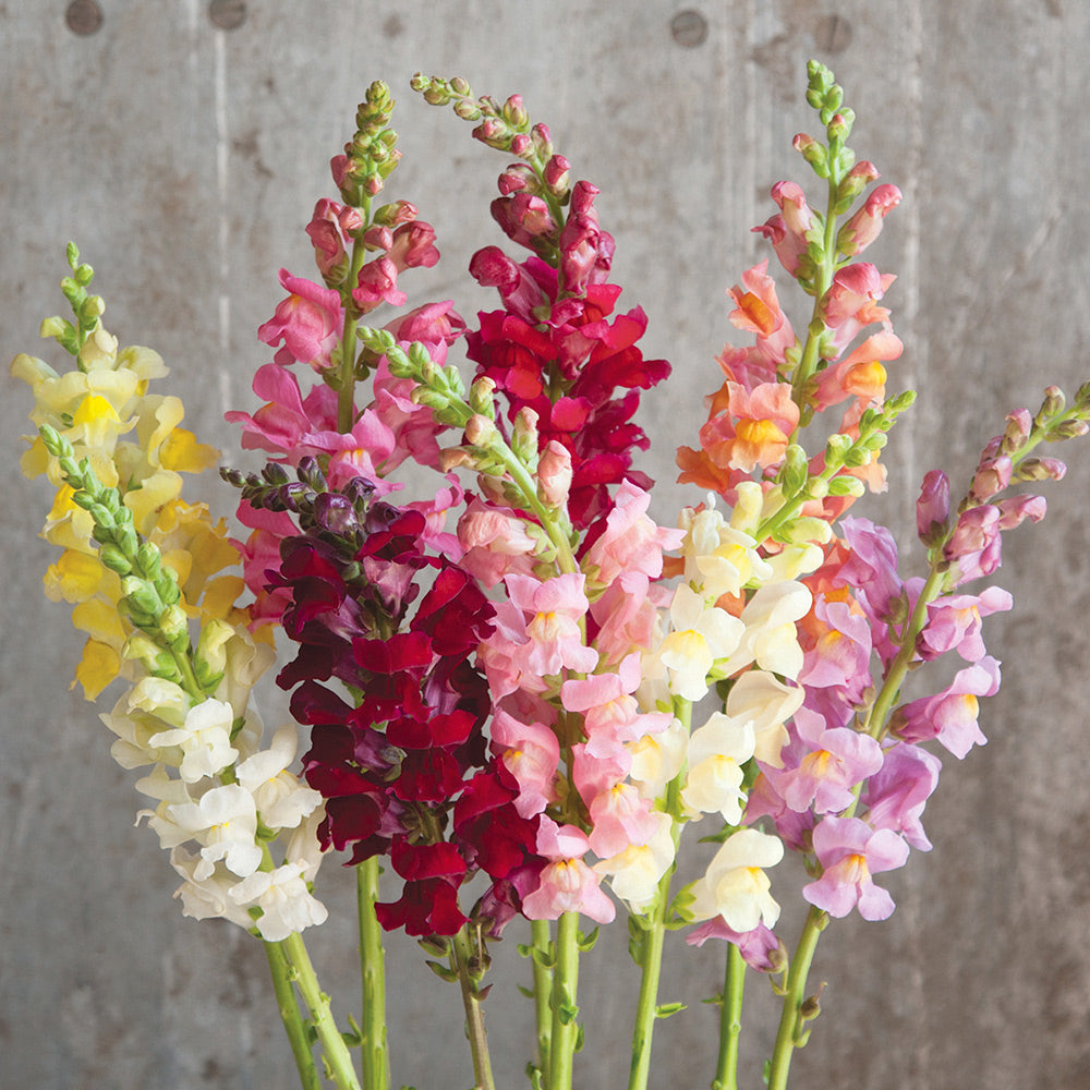 A reliable and high quality mix of attractive snapdragons that includes shades of rose, cherry, pink, lavender, burgundy, peach, lemon and white. A main season mix that flowers well under long days and tolerates light frost. Edible flower. Vase life 7-10 days.