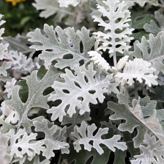 Cineraria ‘Silverdust’ (Cineraria maritima, also known as Senecio cineraria) is a striking foliage plant valued for its finely cut, silvery-grey leaves that provide strong contrast in both garden beds and floral arrangements. Its soft, felted foliage is evergreen in mild climates and offers year-round interest, especially when paired with brightly coloured annuals or perennials.