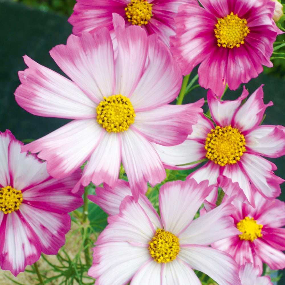 A delightful cosmos, the bicolour flowers are blush white with bright-pink striping or edging to the petals. Great as a cut flower or for attracting pollinators to your garden, cosmos are easy to grow and will flower over a long period of time if regularly picked or deadheaded.
