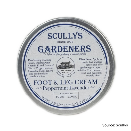 Indulge your hardworking hands and feet with the restorative power of Scullys Gardeners Peppermint & Lavender Foot & Leg Cream. Formulated with a nourishing blend of natural ingredients help soothe and revive overworked hands, legs and feet.
