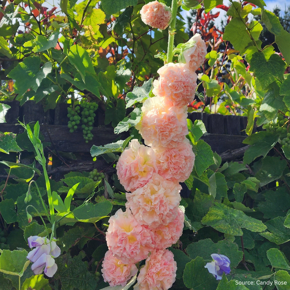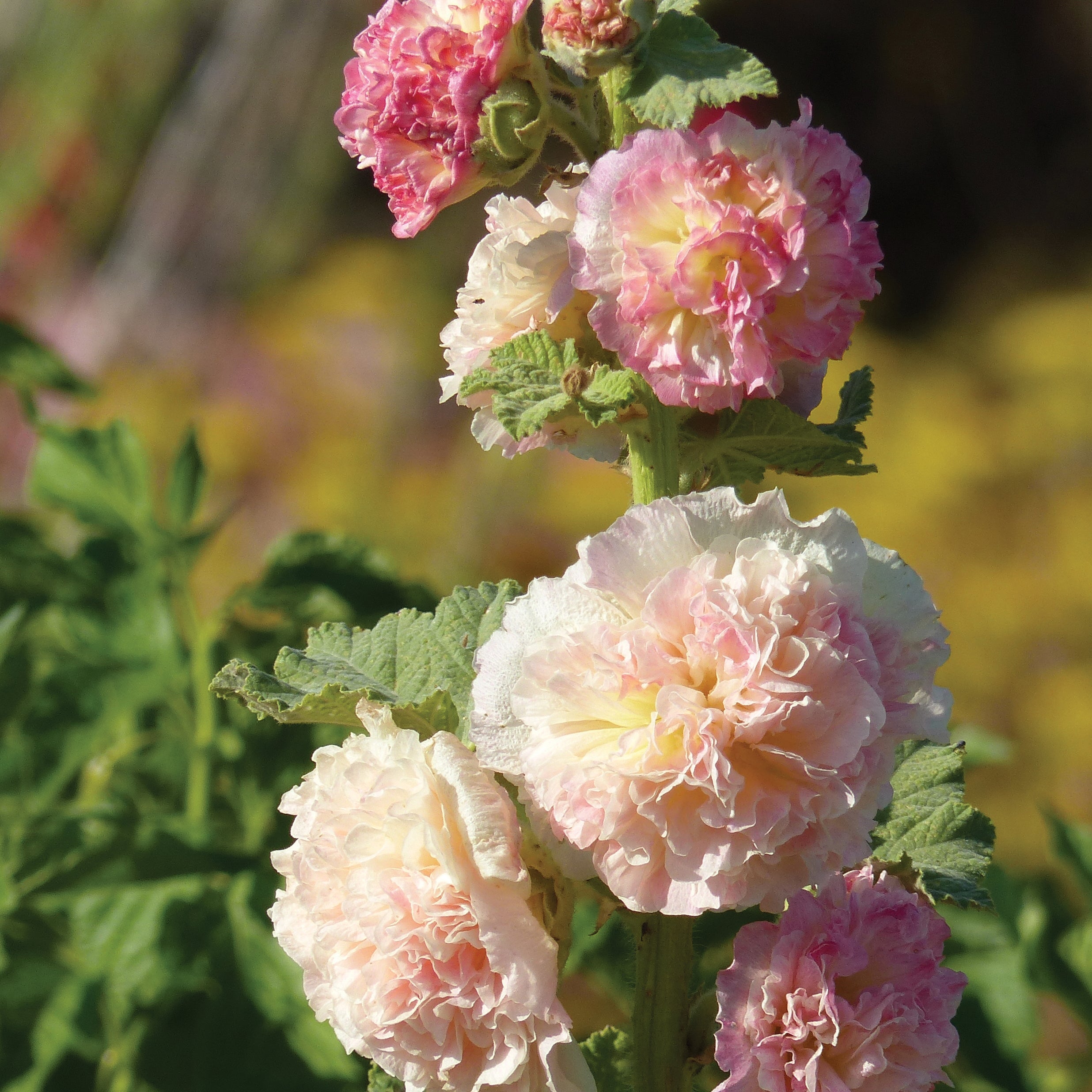 A well-known selection favoured for its showy, double blossoms. The blush-peach, frilly flowers are gorgeous at the back of the border with the tall spires adding vertical interest. Blooms abundantly in mid to late summer. When sown early it will bloom the first year.