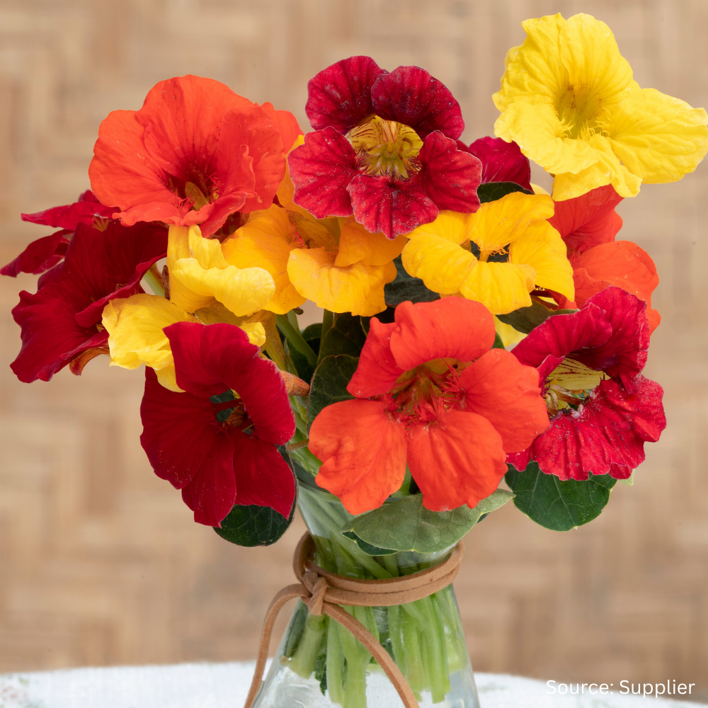 An attractive mix of sunrise hued flowers in orange, salmon, gold, yellow and red. Ideal in containers, hanging baskets or small spaces due to the more compact habit. A versatile plant attracting pollinators and repelling pests with all parts edible. Fast growing and easy to grow.
