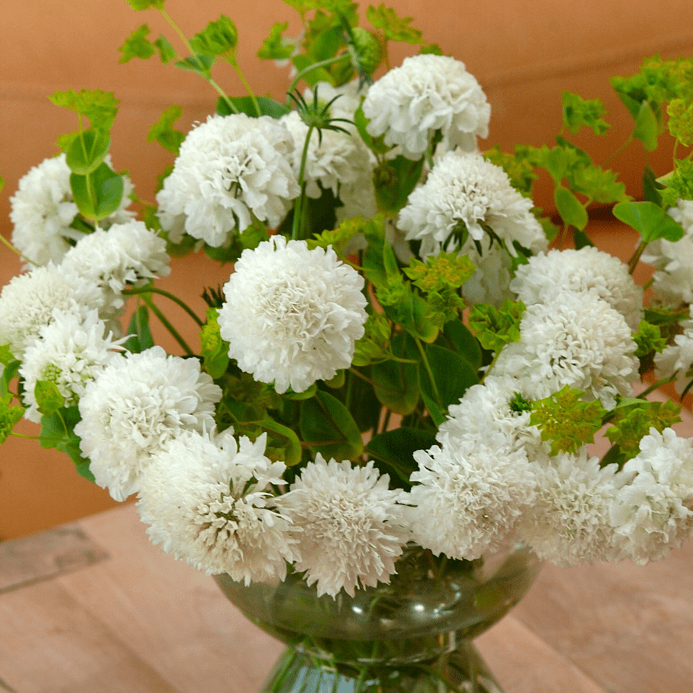 Pure-white, double-petalled scabiosa with long, sturdy stems, elegant in the border or picked for a bouquet. Easy to grow, a prolific producer of blooms which can be cut for fresh or dried floral arrangements. Harvest when flowers are still in bud or about to open. Tall growing, requires support.
