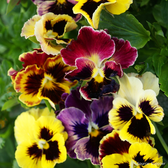 Viola ‘Rococo Frill Mix’ features blooms in a rich palette of purples, yellows, blues and creams, each adorned with distinctive ruffled, frilled petals that give the flowers a romantic, old-world charm. Compact and free-flowering, Rococo Frill Mix produces a profusion of blooms over an extended season, from early spring through to late autumn, ensuring continuous colour and delight in the garden.