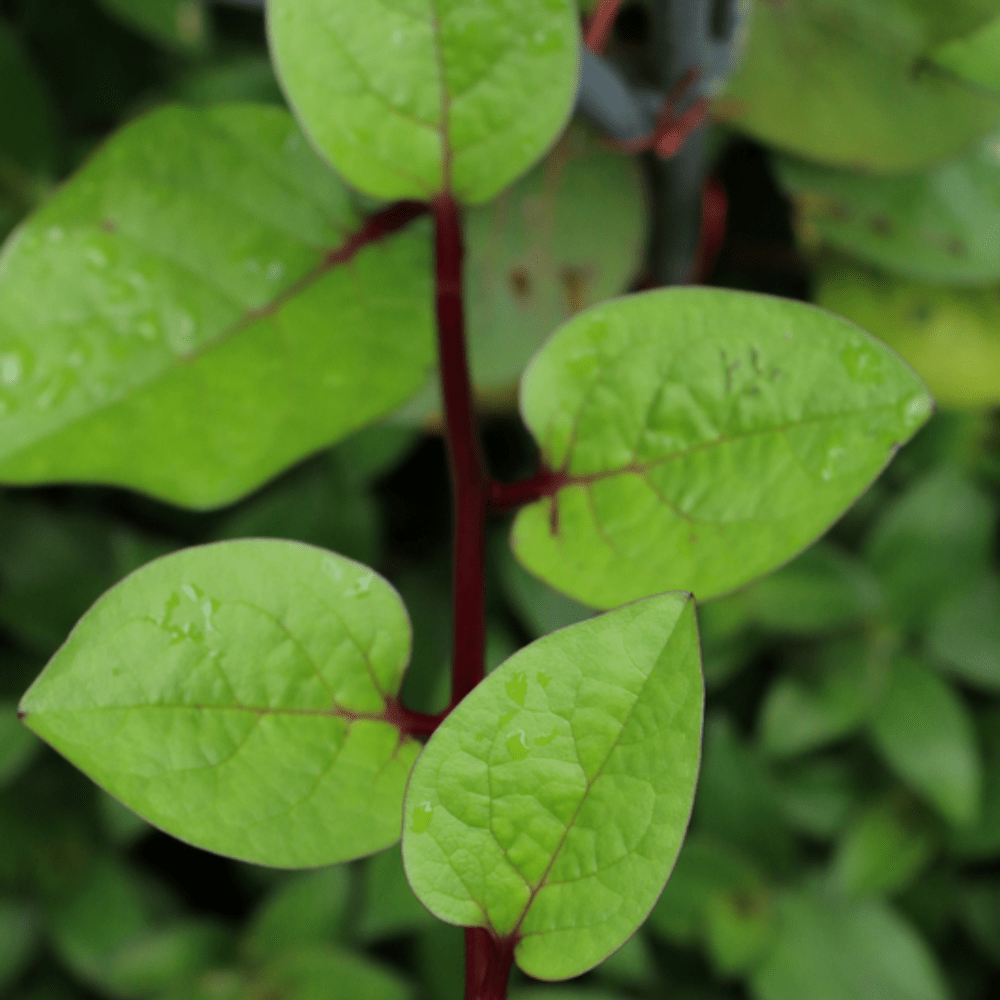 A heat-loving vine with crimson stems and glossy, heart-shaped leaves with a mild flavour. Seeds are best started indoors 6-8 weeks before planting outdoors. Cultivate in well-drained soil with ample sunlight and support for climbing, attractive in pots with a frame. Highly sensitive to frost.
